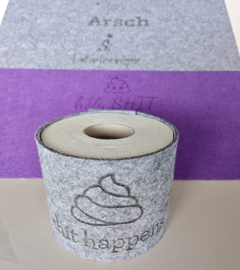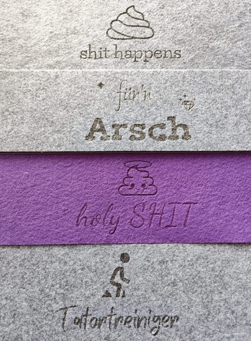 Die Datei kann individuell beschriftet werden oder du nutzt die mitgelieferten Dateien: shit happens, holy shit, Tatortreiniger, für’n Arsch.